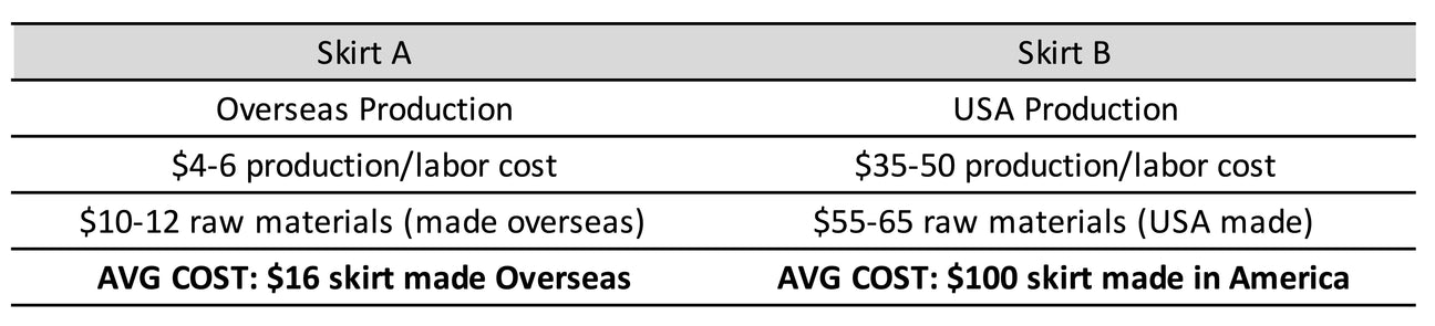 The price of producing in the USA is anywhere from 8-10x what it is overseas. I’ve seen the numbers; let’s talk about them for a minute…here are rough estimates on only the cost of materials and production of a simple, basic skirt (it does not include other costs such as: staff, advertising, or new production to name a few)